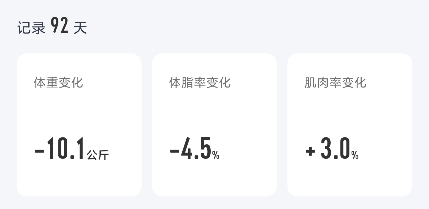 - 体重:从 92.4kg 到 82.3kg,减重 10.1kg。